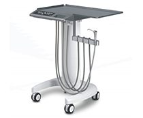 推车式不锈钢器械盘 1.推车式器械盘改善牙椅承载情况,使整机更稳定,消除器械臂给患者带来的压迫感。2.底部采用铝合金压铸工艺,提高结构稳定性,不变形、不生锈。